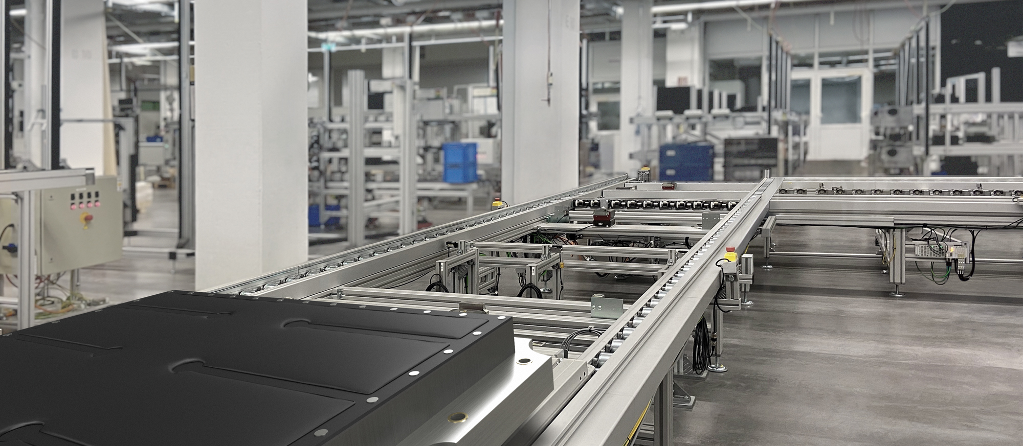 Das TS7 Transfersystem ermöglicht es schwerste Batteriepacks bis weit über eine Tonne sicher und zuverlässig durch die Montage zu transportieren.