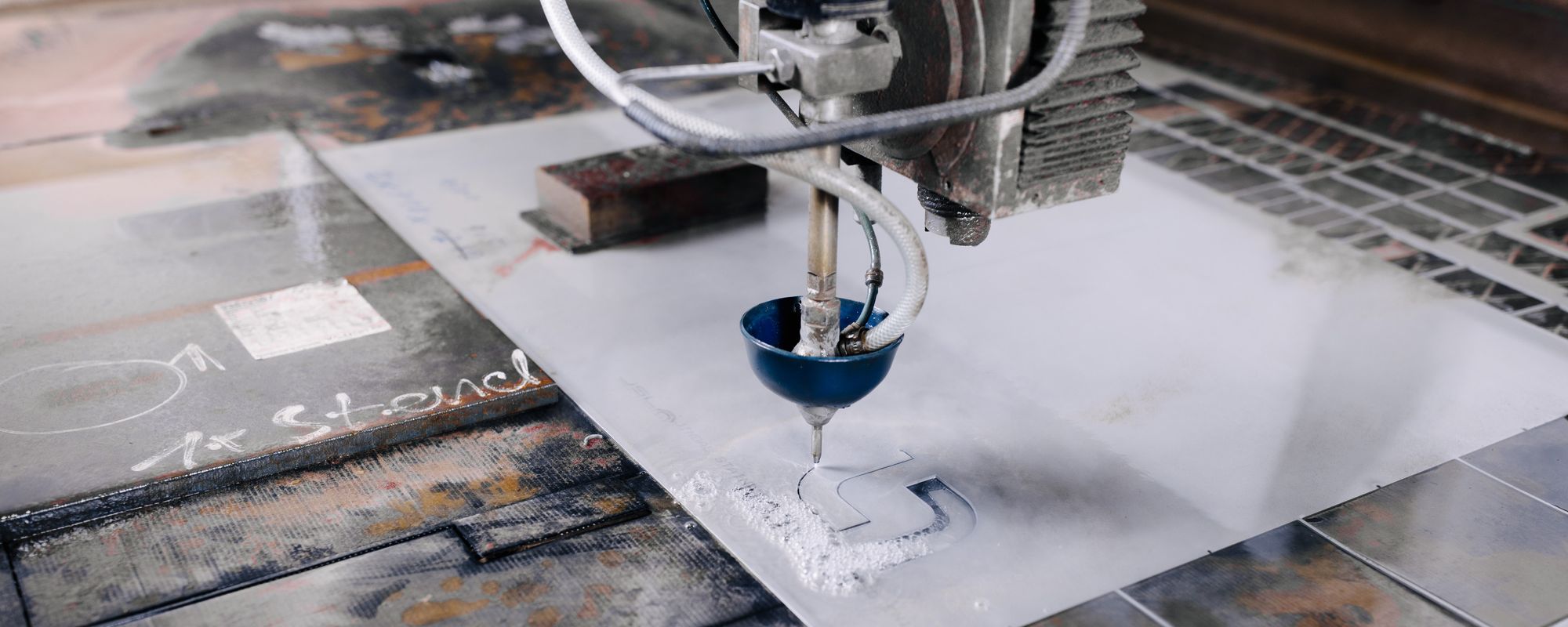Die gängigsten Metalle bis zu harten und weichen Kunststoffen, aber auch Steine und Schaumstoffe können auf unserer Schneidanlage bearbeitet werden. Mit Hilfe eines speziellen Abrasivsandes sowie einem Druck von bis zu 3.500 bar, werden Geometrien aller Art zugeschnitten.